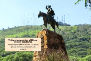 En la base del cerro se levanta el monumento al héroe gaucho Martín Miguel de Güemes. Alrededor, los murales y esculturas urbanas cuentan la historia moderna de la provincia.